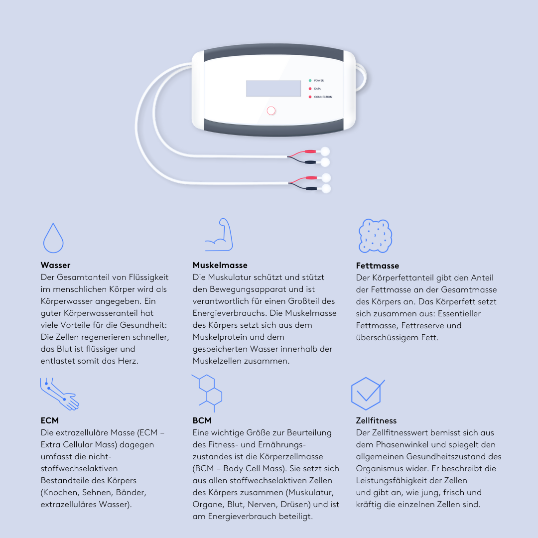 Die Analyse der Körperzusammensetzung erfolgt durch die Bioelektrische Impedanzanalyse (BIA), eine der präzisesten und anerkanntesten Methoden, um die Körperzusammensetzung zu analysieren.
