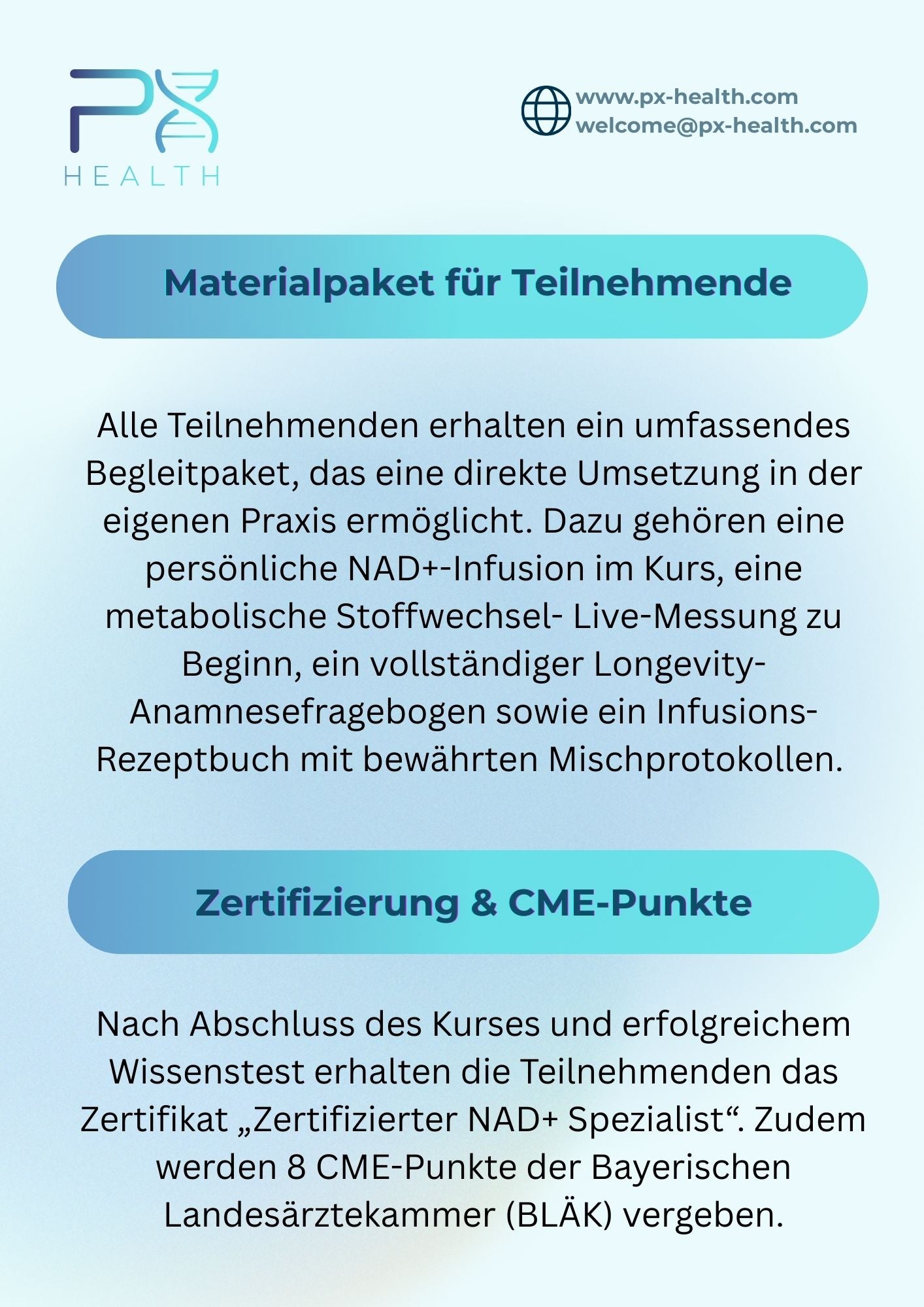 • Sie entwickeln sich über eine reine „Dripclinic“ hinaus zum anerkannten Experten in der Longevity-Medizin.
